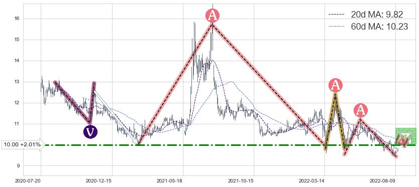 2022-04-25: 第一阻力位10.00有效抑制了下跌浪,成功阻止了价格的继续下跌。