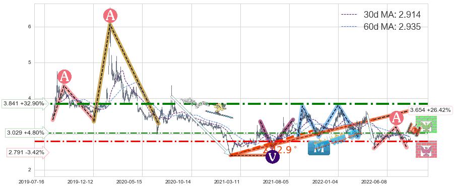 ♘ 阻力价格位3.029,可信任强度36.71%,距离最后交易2022-08-12形成的收盘价格2.890相差 +4.80%
