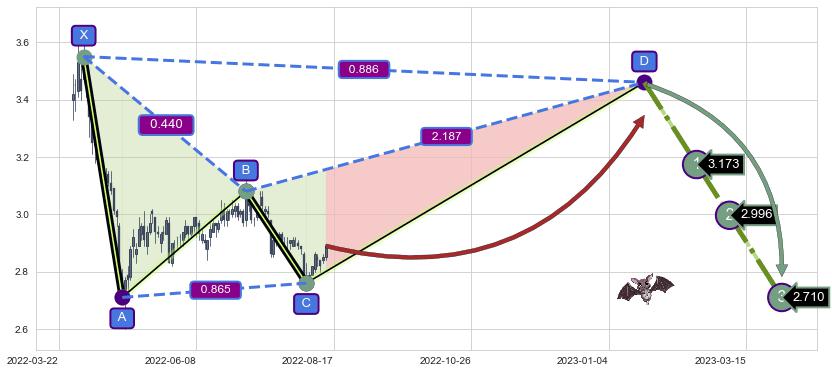 ➣ 未完成【蝙蝠】形态起点X: 2022-04-06, 已到达C点: 2022-08-03, 预测最终D点: 2023-01-23, 共205交易日