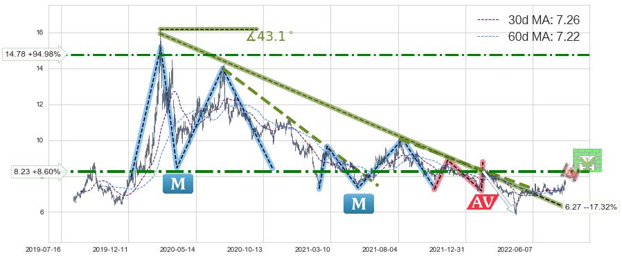 ➢ 【已确认突破】最后价格:7.58与最小【整理】第一目标价格→(2022-12-08: 3.541 )相较: 下跌空间【较大】