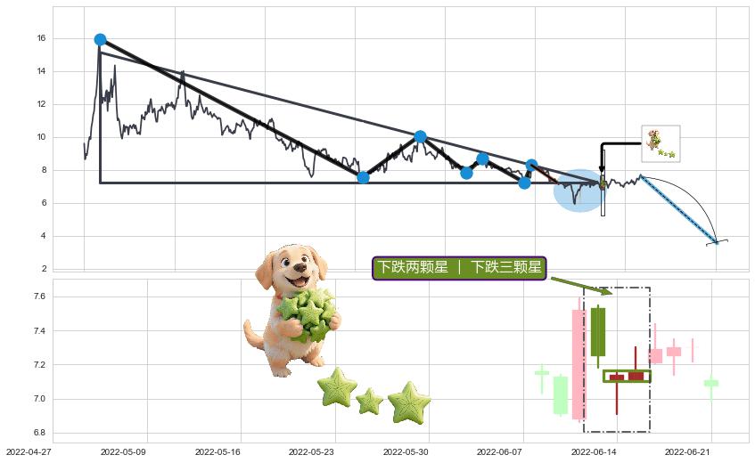 ➢ 【多方力量耗尽,空方打破攻守平衡点】下降三角形中继整理, 已在2022-03-25突破【支撑】颈线 7.25 →演变成下降通道