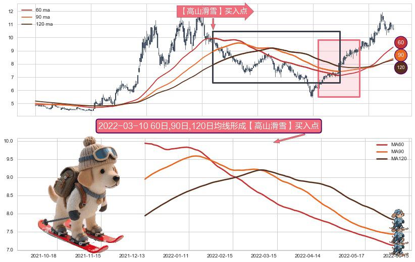 形态多维评估: ⚀ 2021-12-13日-2022-06-06日显现 60日-90日-120日均线 【高山滑雪】买入点 看多信号,后市看涨,买入