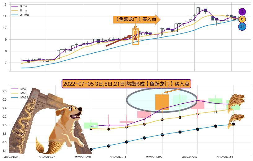 形态多维评估: ⚀ 2022-07-05日显现 3日-8日-21日均线 【鱼跃龙门】买入点 看多信号,后市看涨,买入