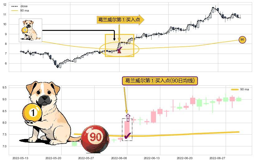 形态多维评估: ⚀ 2022-06-06-日显现 葛兰威尔均线 90日均线 第买①入点 走势反转见底信号,后市看涨,买进信号