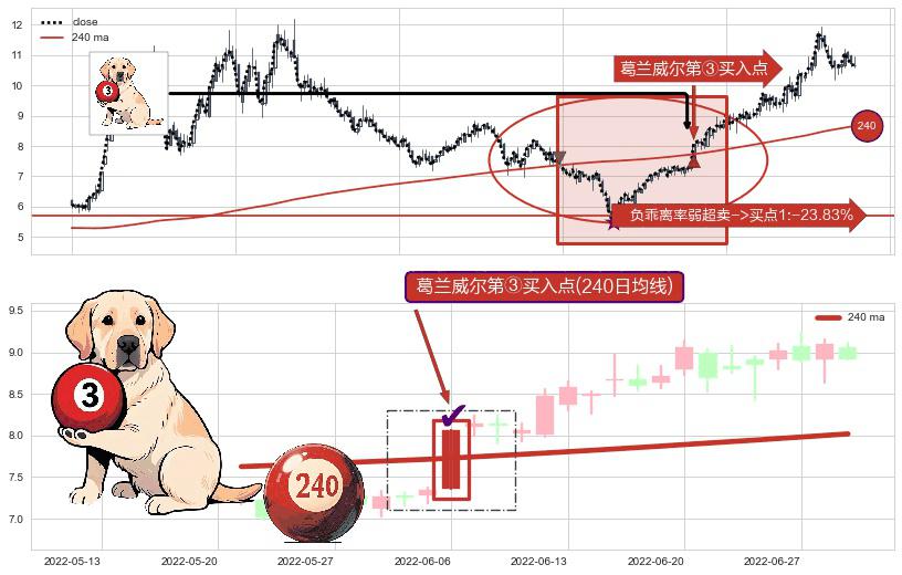 形态多维评估: ⚀ 2022-06-06-日显现 葛兰威尔均线 240日均线 第③买入点 上升趋势的中继信号,后市看涨,买进信号