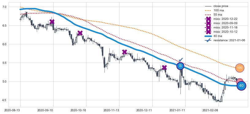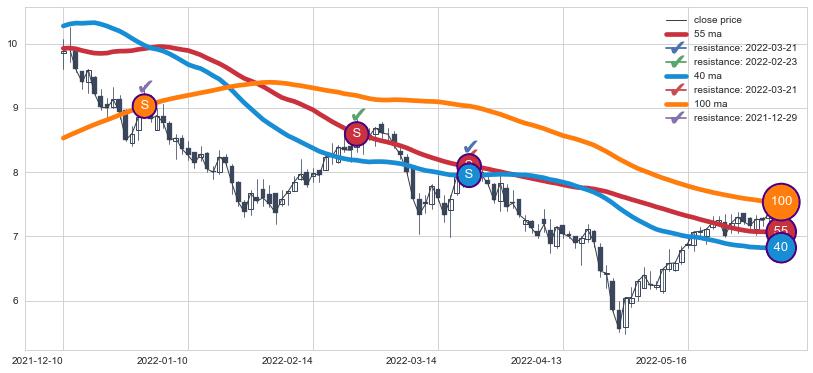 下跌趋势2021-12-10-2022-06-02,均线40, 100, 55确认关键阻力3处