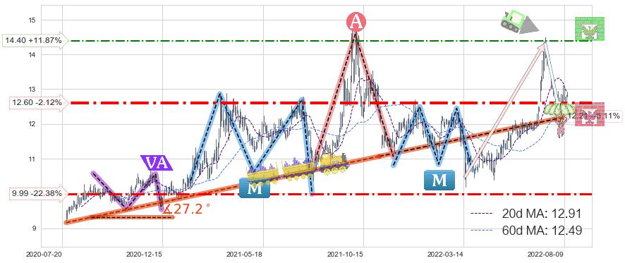 ♘ 阻力价格位14.40,可信任强度54.70%,距离最后交易2022-08-12形成的收盘价格12.87相差 +11.87%