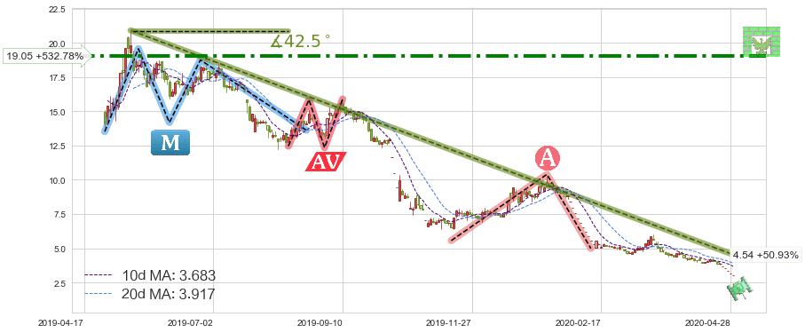 从2019-05-16至2020-04-29,共包含234个交易日,阶段股价下跌-171.48%,阶段股价变动位移路程比: 1 : 3,下跌趋势角度: 42.5