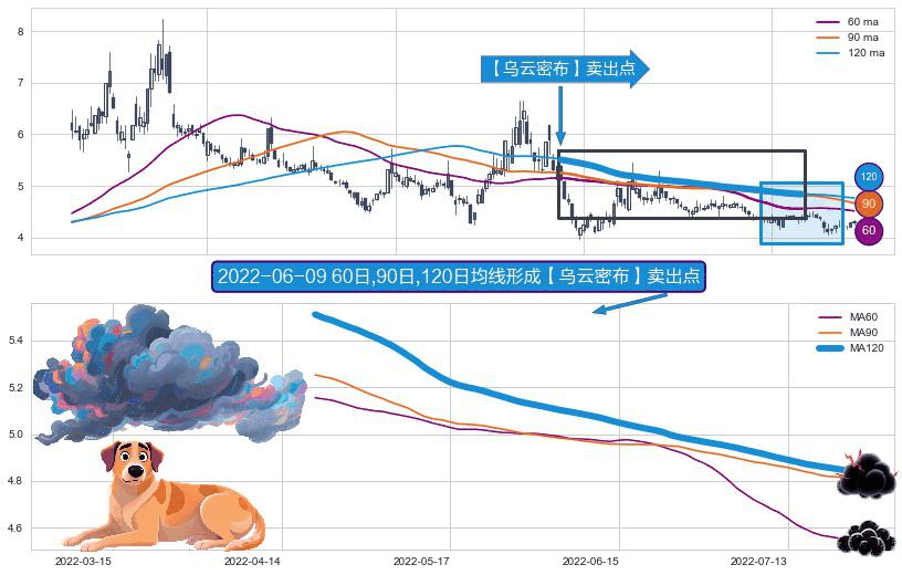 形态多维评估: ⚀ 2022-04-20日-2022-07-25日显现 60日-90日-120日均线 【乌云密布】卖出点 看空信号,后市看跌,卖出
