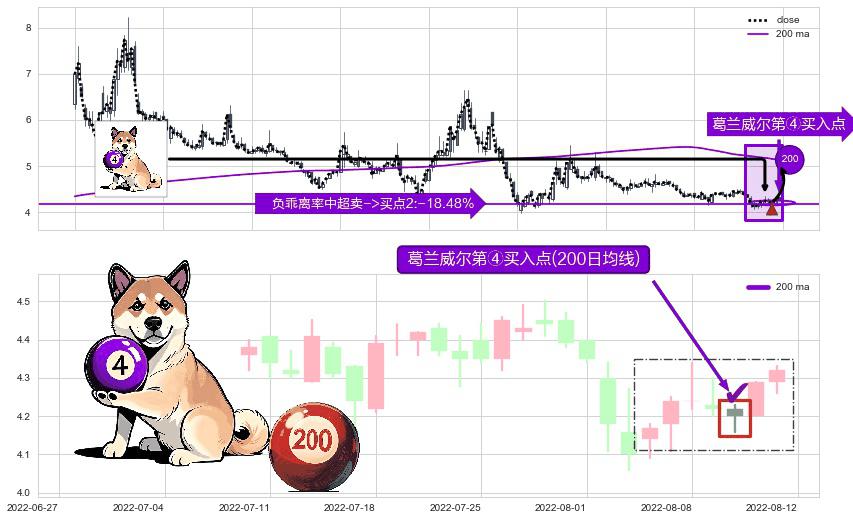 形态多维评估: ⚀ 2022-08-10-日显现 葛兰威尔均线 200日均线 第④买入点 下降趋势均值回复的短线反弹信号,后市看涨,买进信号