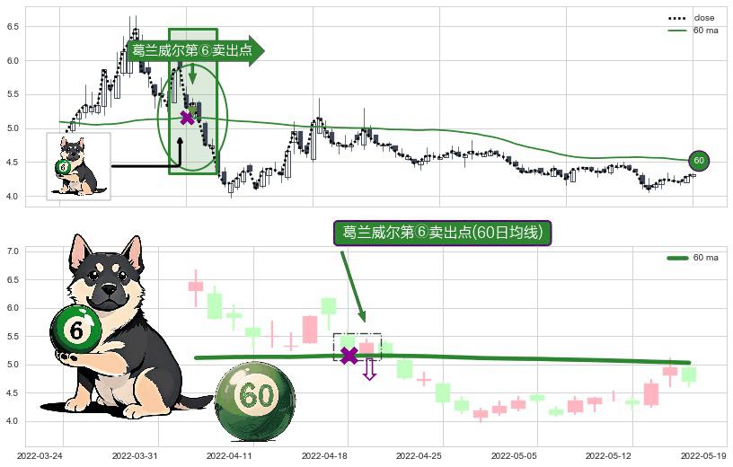 形态多维评估: ⚀ 2022-04-19-日显现 葛兰威尔均线 60日均线 第⑥卖出点 走势反转见顶信号,后市看跌,卖出信号