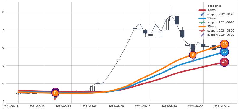 上涨趋势2021-08-11-2021-10-14,均线40, 25, 30确认关键支撑2处