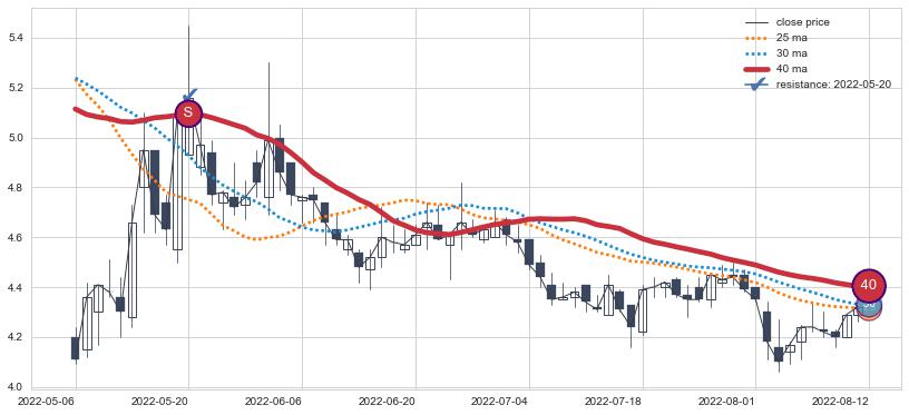 下跌趋势2022-05-06-2022-08-12,均线40确认关键阻力1处
