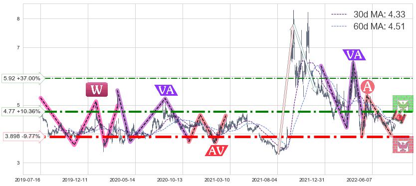 ♘ 阻力价格位4.77,可信任强度79.23%,距离最后交易2022-08-12形成的收盘价格4.32相差 +10.36%