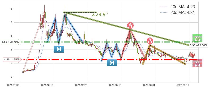 ♘ 支撑价格位4.26,可信任强度88.89%,距离最后交易2022-08-12形成的收盘价格4.32相差 -1.35%