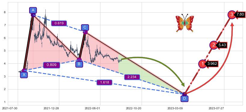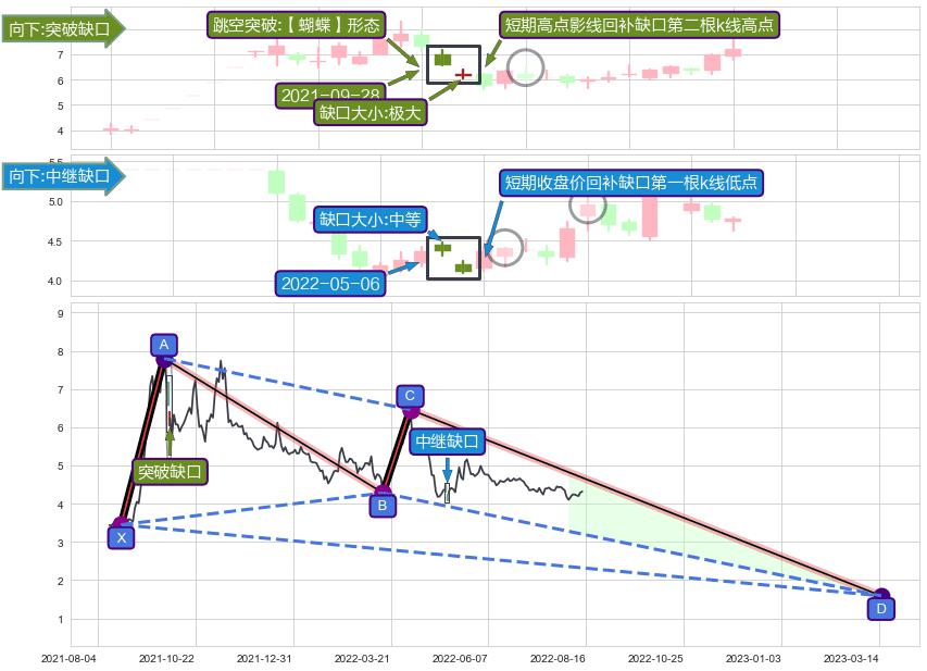 ➣ 未完成【蝴蝶】形态起点X: 2021-08-20, 已到达C点: 2022-04-06, 预测最终D点: 2023-03-15, 共383交易日