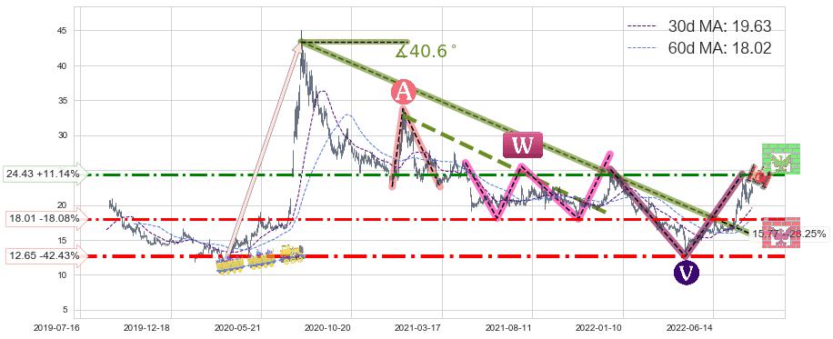 ♘ 阻力价格位24.43,可信任强度69.35%,距离最后交易2022-08-12形成的收盘价格21.98相差 +11.14%