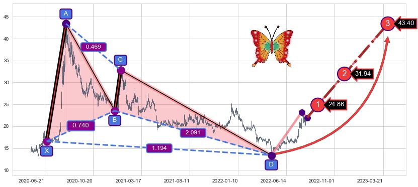 ➣ 已完成【蝴蝶】形态起点X: 2020-05-27, 终点D: 2022-04-26, 共466交易日