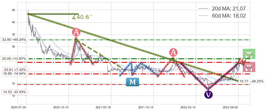 ♘ 阻力价格位25.05,可信任强度57.07%,距离最后交易2022-08-12形成的收盘价格21.98相差 +13.97%