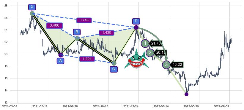 ➣ 已完成【鲨鱼】形态起点X: 2021-04-07, 终点D: 2021-12-20, 共173交易日