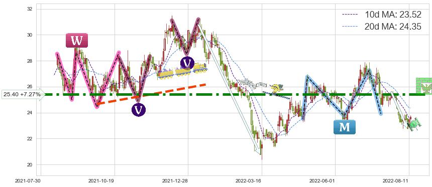 2021-08-30: 第一阻力位25.40有效抑制了下跌浪,成功阻止了价格的继续下跌。