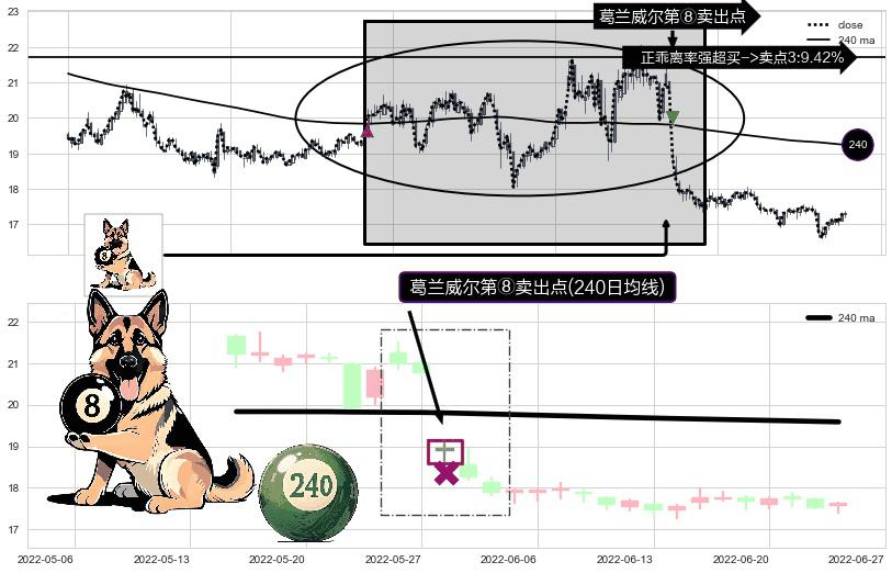 形态多维评估: ⚀ 2022-05-30-日显现 葛兰威尔均线 240日均线 第⑧卖出点 下降趋势的中继信号,后市看跌,卖出信号