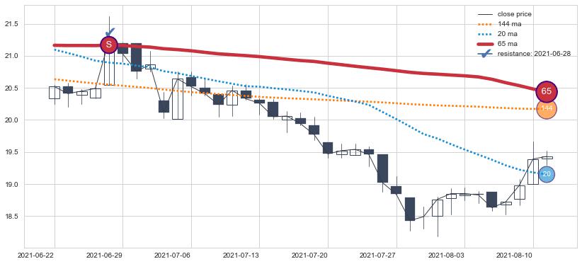 下跌趋势2020-08-26-2021-03-16,均线144, 65确认关键阻力2处