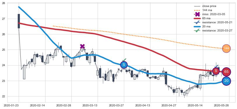 下跌趋势2020-01-23-2020-05-26,均线65, 20确认关键阻力2处