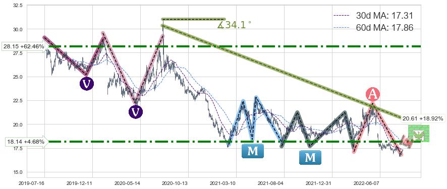 ♘ 阻力价格位28.15,可信任强度73.05%,距离最后交易2022-08-12形成的收盘价格17.33相差 +62.46%
