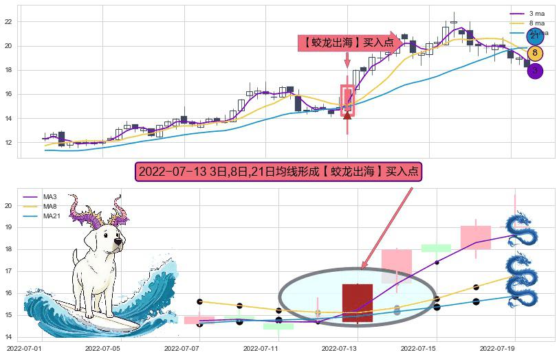 形态多维评估: ⚀ 2022-07-13日显现 3日-8日-21日均线 【蛟龙出海】买入点 看多信号,后市看涨,买入