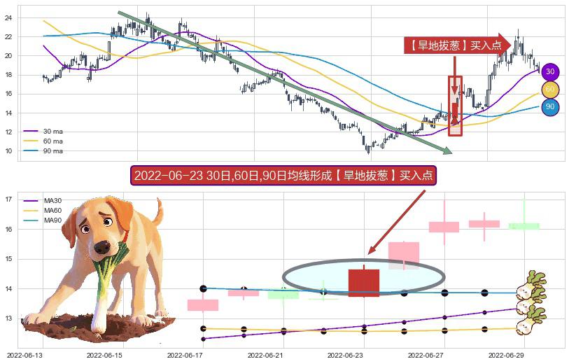 形态多维评估: ⚀ 2022-06-23日显现 30日-60日-90日均线 【旱地拔葱】买入点 看多信号,后市看涨,买入