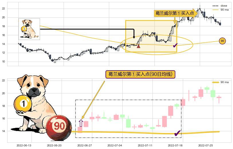 形态多维评估: ⚀ 2022-06-23-日显现 葛兰威尔均线 90日均线 第买①入点 走势反转见底信号,后市看涨,买进信号