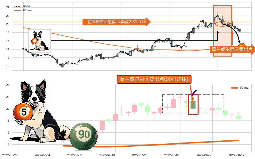 形态多维评估: ⚀ 2022-08-03-日显现 葛兰威尔均线 90日均线 第⑤卖出点 上升趋势均值回复的短线回落信号,后市看跌,卖出信号