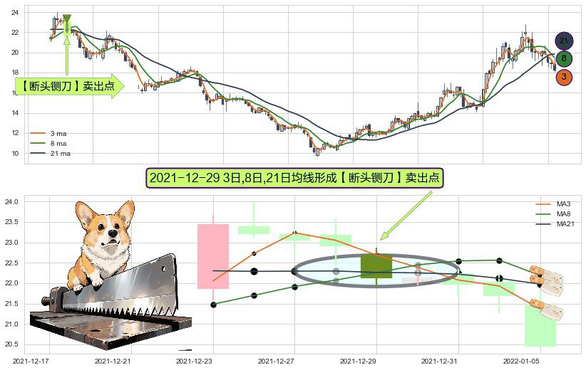 形态多维评估: ⚀ 2021-12-29日显现 3日-8日-21日均线 【断头铡刀】卖出点 看空信号,后市看跌,卖出