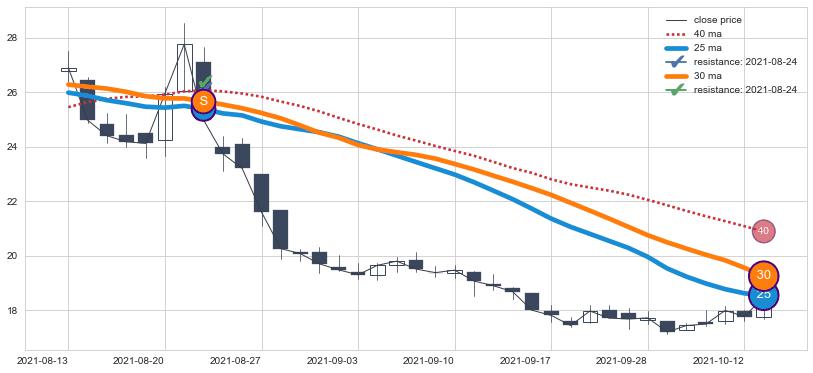 下跌趋势2021-08-13-2021-10-13,均线25, 30确认关键阻力1处