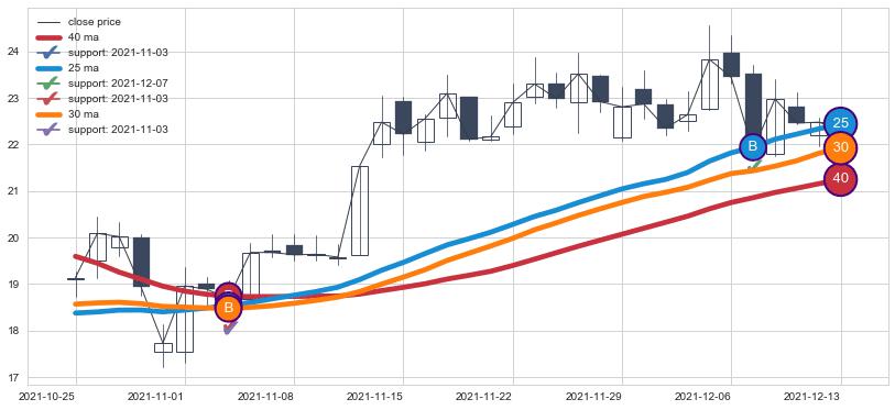 上涨趋势2021-10-25-2021-12-13,均线40, 25, 30确认关键支撑2处