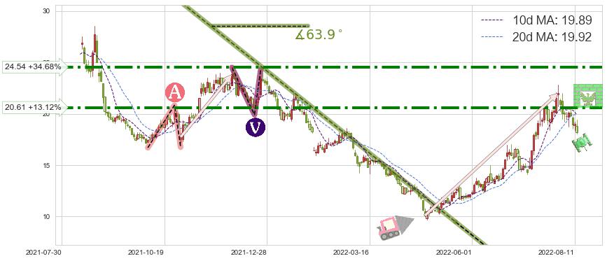 ♘ 阻力价格位24.54,可信任强度70.22%,距离最后交易2022-08-12形成的收盘价格18.22相差 +34.68%