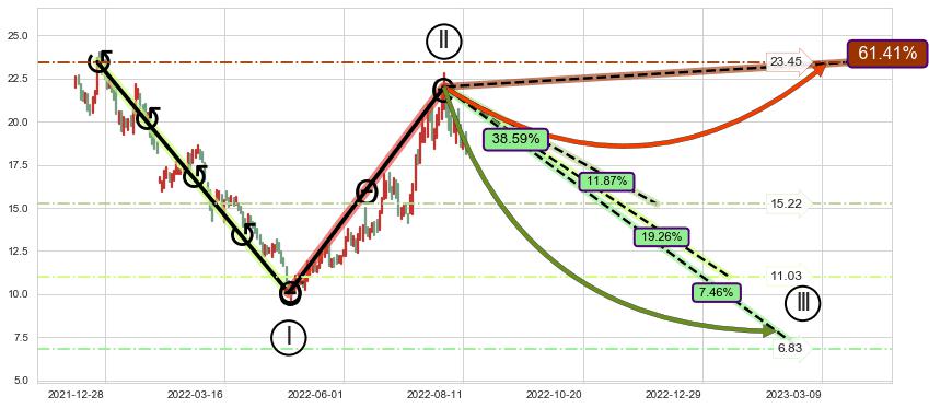➢ 循环浪继续向上【最低】位置(2023-01-03, 22.36),匹配聚类样本比例31.43%, 可能性概率11.95%
