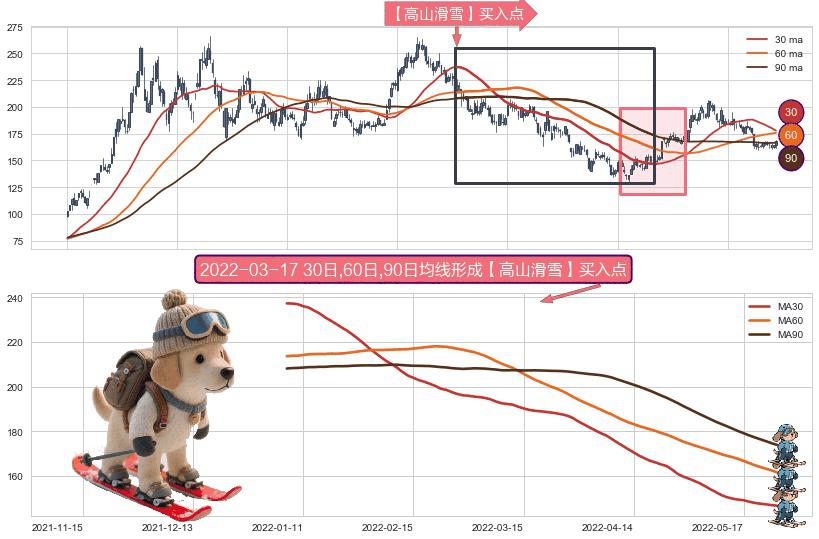 ⚀ 2022-01-06日-2022-05-25日显现 30日-60日-90日均线 【高山滑雪】买入点 看多信号,后市看涨,买入