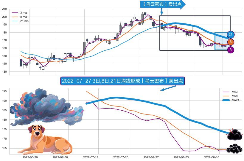 ⚀ 2022-07-11日-2022-08-12日显现 3日-8日-21日均线 【乌云密布】卖出点 看空信号,后市看跌,卖出