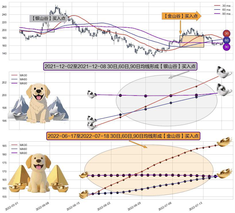 ⚃ 2022-06-20-日至2022-07-18-日显现 30日-60日-90日均线 【金山谷】买入点 其再次确认了买入信号,可靠性更强,买入