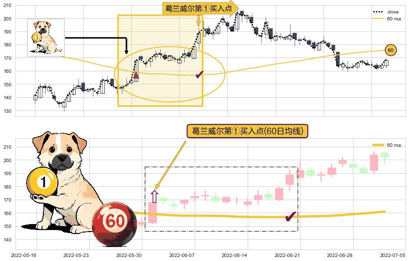 ⚀ 2022-05-31-日显现 葛兰威尔均线 60日均线 第买①入点 走势反转见底信号,后市看涨,买进信号