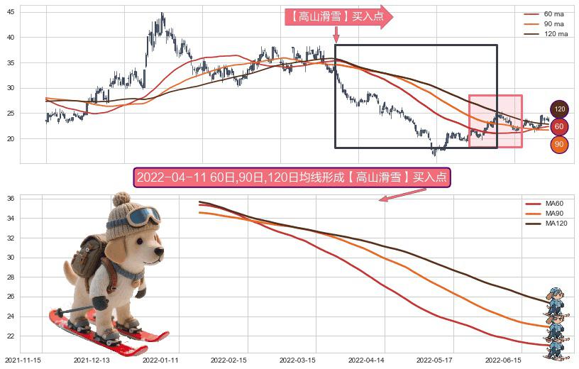 ⚀ 2022-01-19日-2022-06-27日显现 60日-90日-120日均线 【高山滑雪】买入点 看多信号,后市看涨,买入