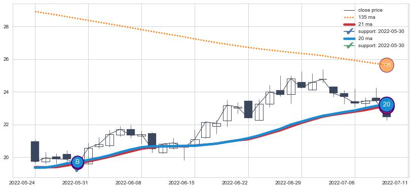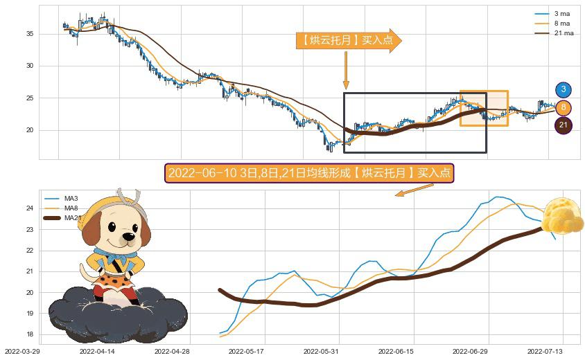 ⚀ 2022-05-09日-2022-07-12日显现 3日-8日-21日均线 【烘云托月】买入点 看多信号,后市看涨,买入