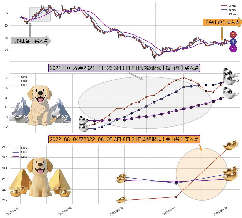 ⚃ 2022-08-05-日至2022-08-05-日显现 3日-8日-21日均线 【金山谷】买入点 其再次确认了买入信号,可靠性更强,买入