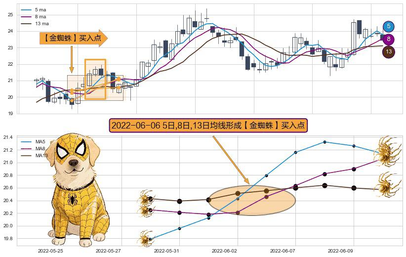 ⚀ 2022-06-06日显现 5日-8日-13日均线 【金蜘蛛】买入点 看多信号,后市看涨,买入