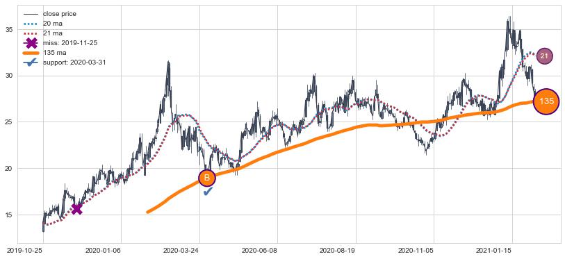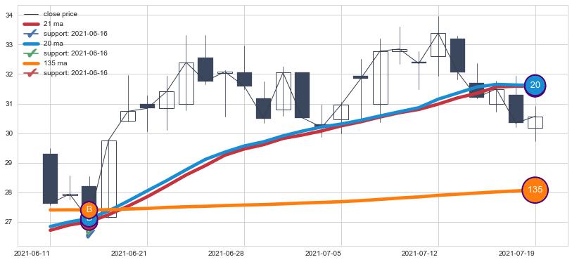 ⚁ MA3和MA8走势平行,且始终保持在短距离内,MA21始终在短中期均线下方,与短中期均线保持一定的距离,微微上行