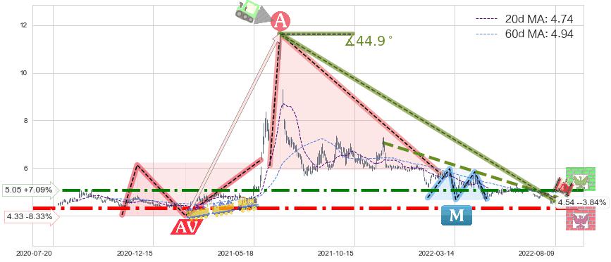 ♘ 支撑价格位4.33,可信任强度99.91%,距离最后交易2022-08-12形成的收盘价格4.72相差 -8.33%