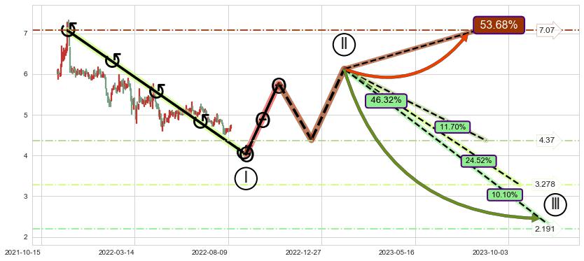 ➣ 循环浪继续向下【平均值】位置(2023-10-19, 3.278),匹配聚类样本比例52.93%, 可能性概率24.52%