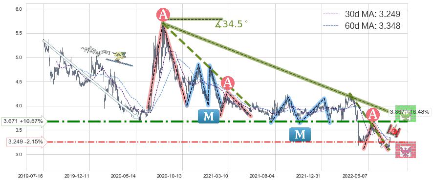 ♞ 30日均线:3.249,60日均线:3.348→ 快线<慢线